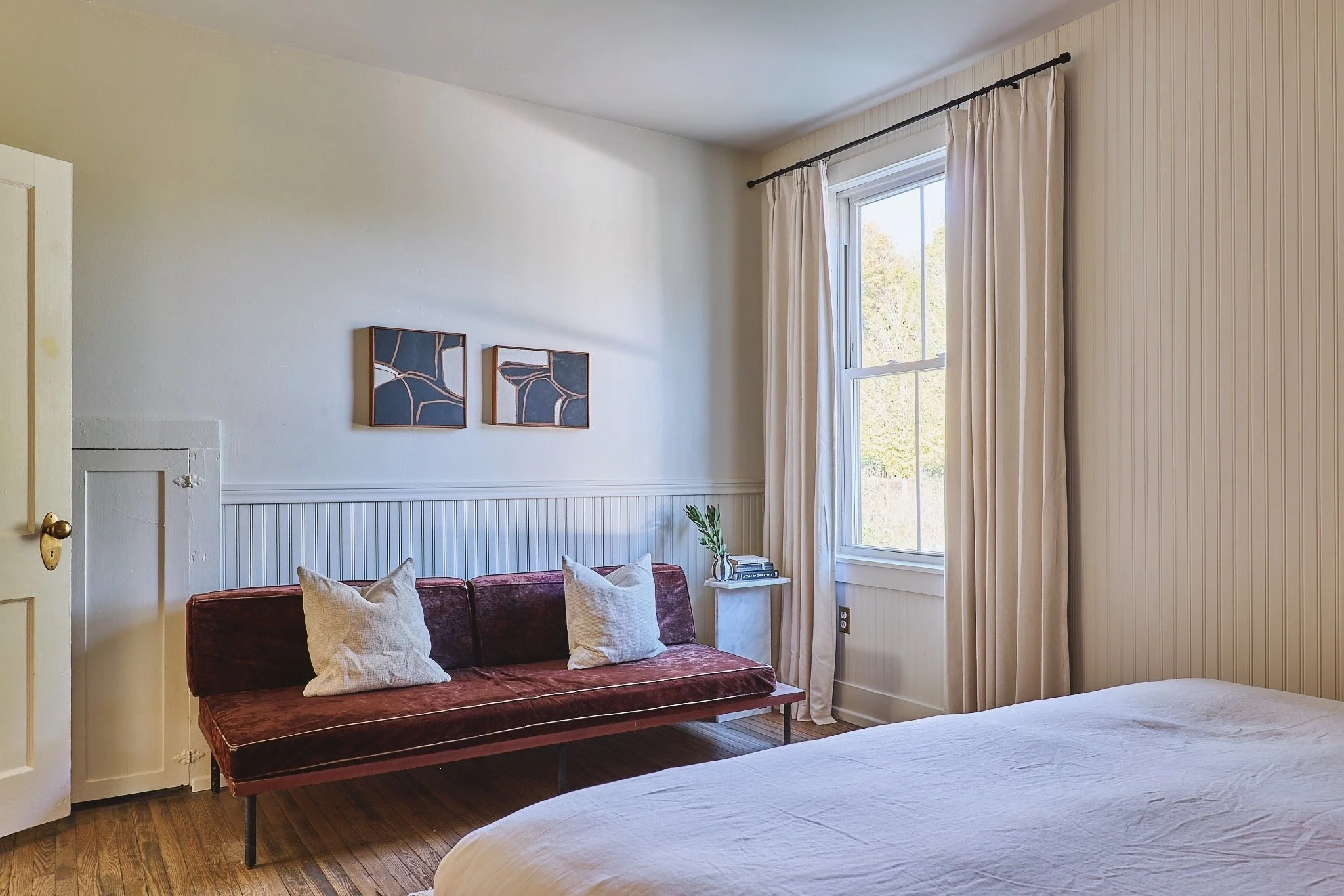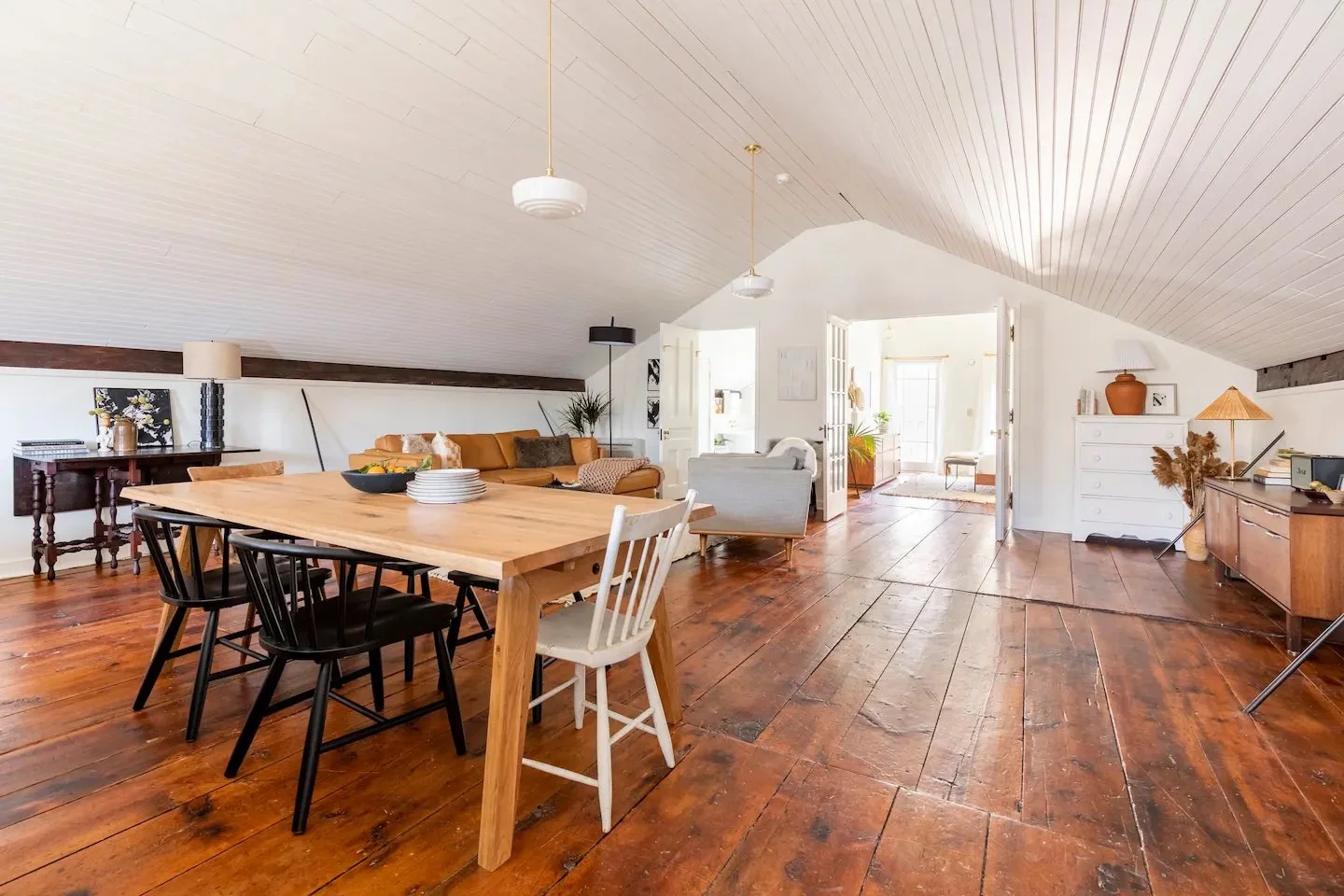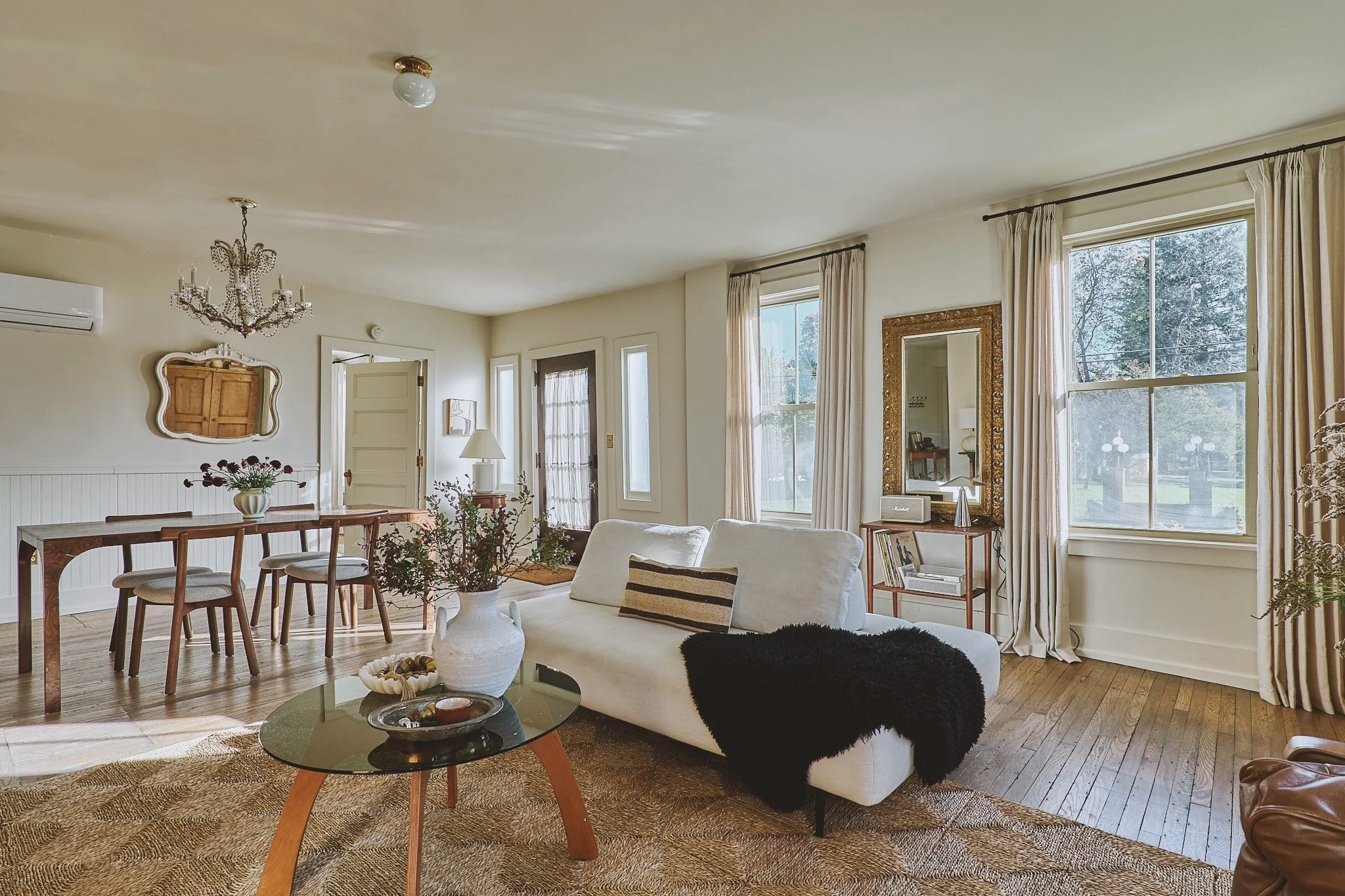 Our warm, historic downstairs space is ideal for intimate gatherings with friends. High ceilings, original hand-painted hardwood floors, and curated vintage décor create a welcoming backdrop for a weekend you won’t forget.